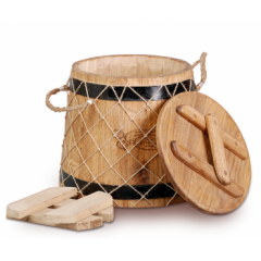 Вещества дубильного типа, содержащиеся в составе дуба, могут похвастать своими консервирующими качествами, что поможет сохранять продукты долгое время. Помимо вышеперечисленных достоинств в наборе с кадкой идет и плетенная вручную сетка, которая упрощает переноску емкости. Такое изделие способна прибавить оригинальности вашему дому и наполнить его уютом, купить кубельчик дубовый 4 л (российский дуб) вы можете у нас по приемлемой стоимости.